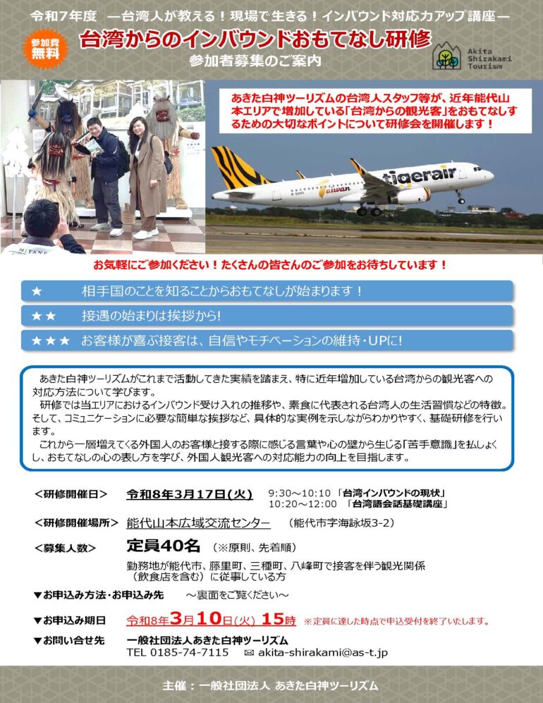 あきた白神ツーリズムでは、台湾観光客への対応を学ぶおもてなし研修を開催します。
