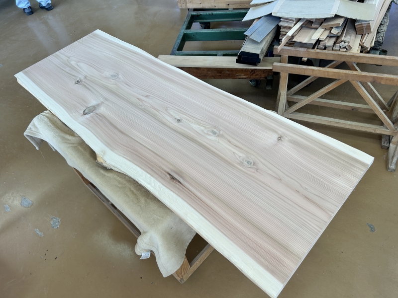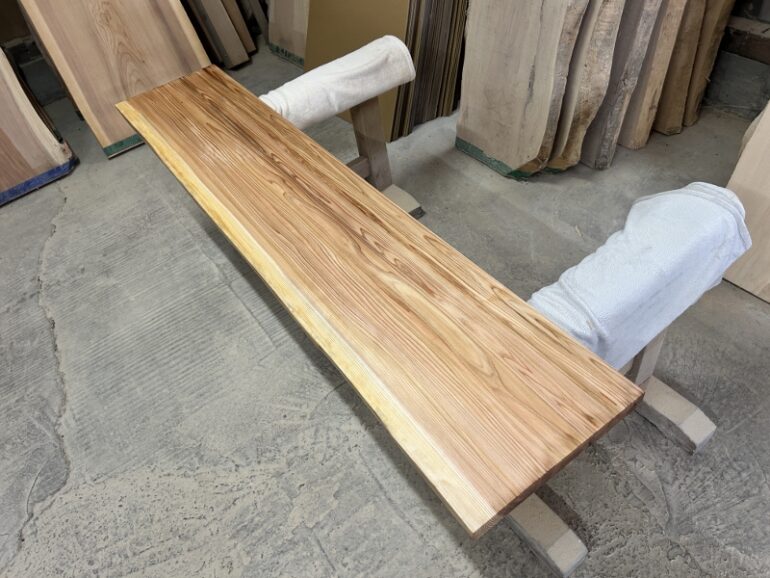 一枚板を仕上げてオイル塗装を塗布しました。カウンターテーブルになります。乾燥後東京までの発送です。次も秋田杉一枚板です。こちらは北海道のお客様からご注文を頂きました。幾らか反っていましたので当店でザックリカンナを掛けました。節が付いていますが赤身の色合いは明るめです。